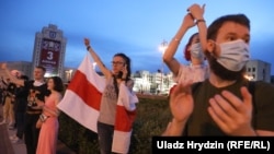 Ближе к полуночи участники мероприятия разбились на несколько отдельных пикетов. Они периодически скандировали "Отпускай" с требованием отпустить задержанного в конце мая блогера Сергея Тихановского и задержанного накануне экс-банкира Виктора Бабарико и других активистов.