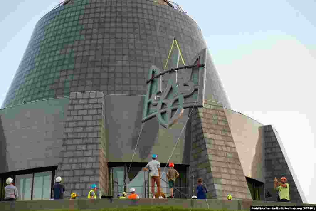 Стоимость герба для монумента составила 28 млн гривен, деньги собрали доноры и меценаты, сообщал Минкульт.