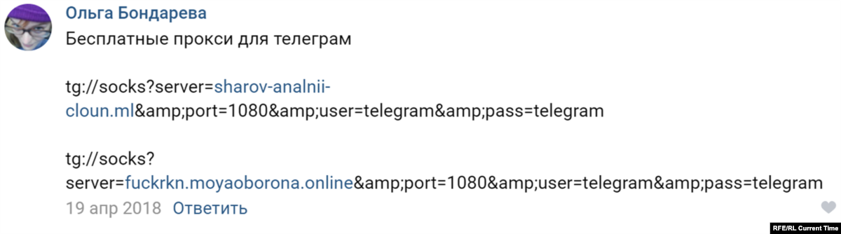 В отличие от других сайтов, созданных тем же человеком или организацией, moyaoborona.online упоминался [1, 2] во "ВКонтакте": фальшивый аккаунт "Ольга Бондарева" советовал его в качестве прокси для обхода блокировок телеграма, а вместе с ним еще один – sharov-analnii-cloun.ml (возможно, намек на Александра Жарова, главу Роскомнадзора в 2012-2020 годах, – при нем ведомство пыталось заблокировать мессенджер).