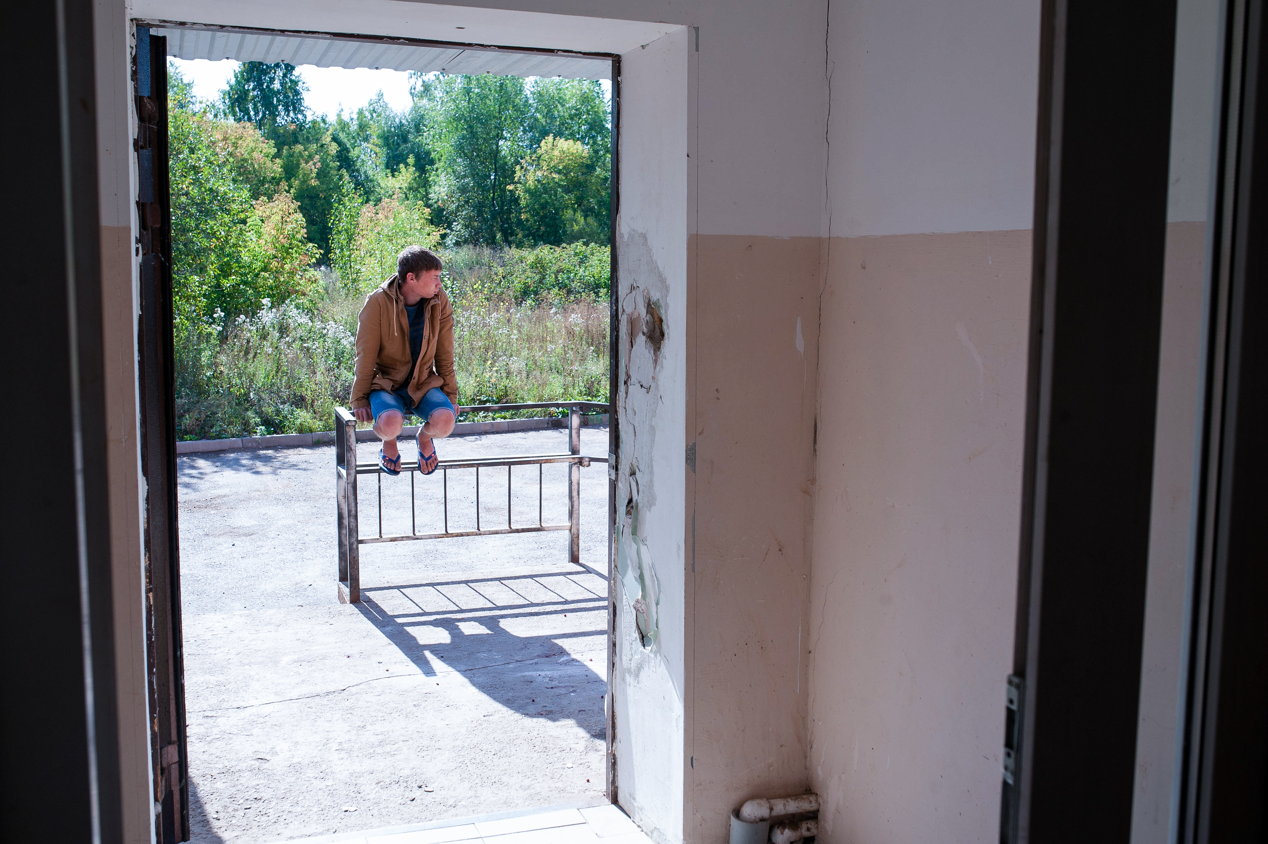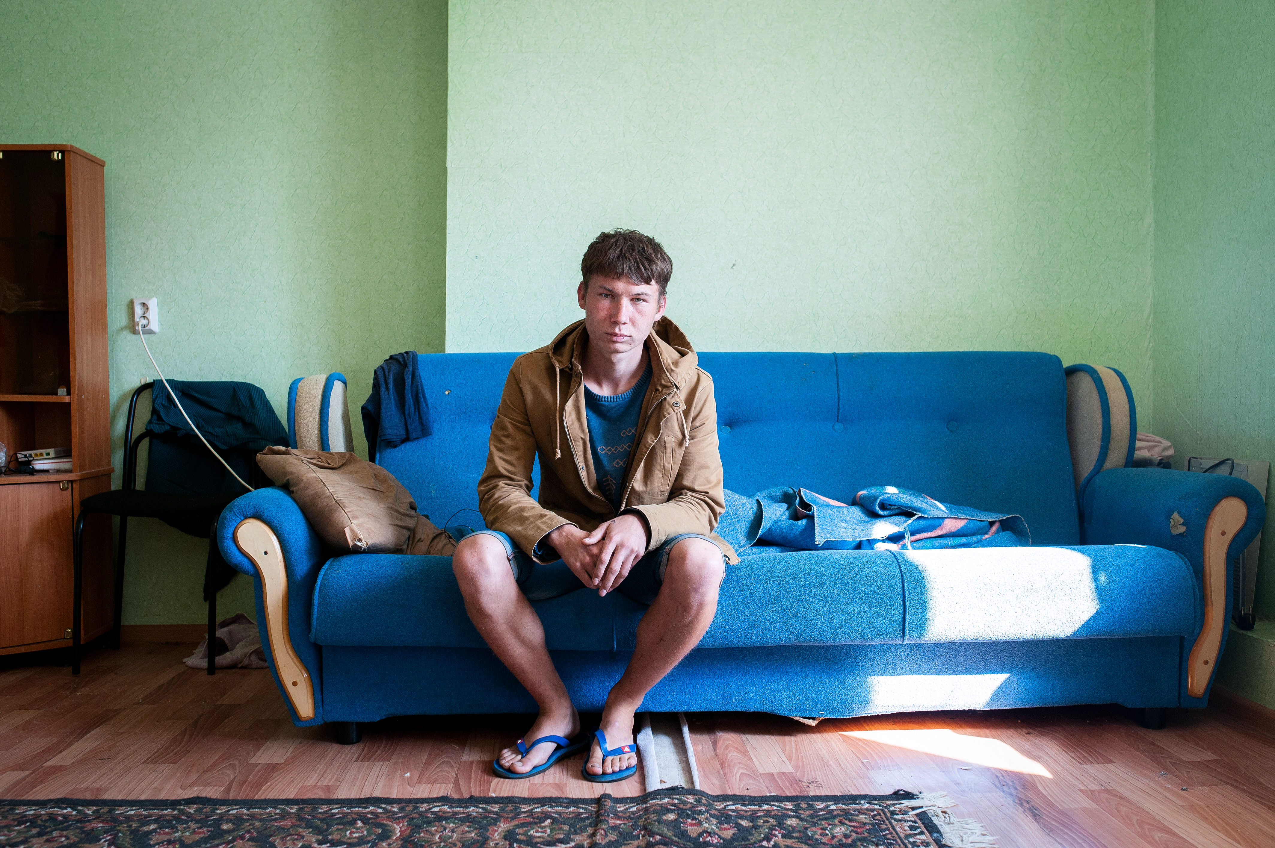 Дверь в квартиру 20-летнего Максима Латышева установлена глазком вниз. Парень объясняет, что недавно к нему приходили гости и в пылу ссоры ее выбили, а ему было не важно, какой стороной ее вернуть на место. Из квартиры Максима видно подъезд — через трещины в стенах. Мебели мало, из электроприборов — старый пылесос и гирлянда. Молодой человек говорит, что живет здесь не постоянно: может остаться у друзей или у опекунов, с которыми сохранил хорошие отношения.