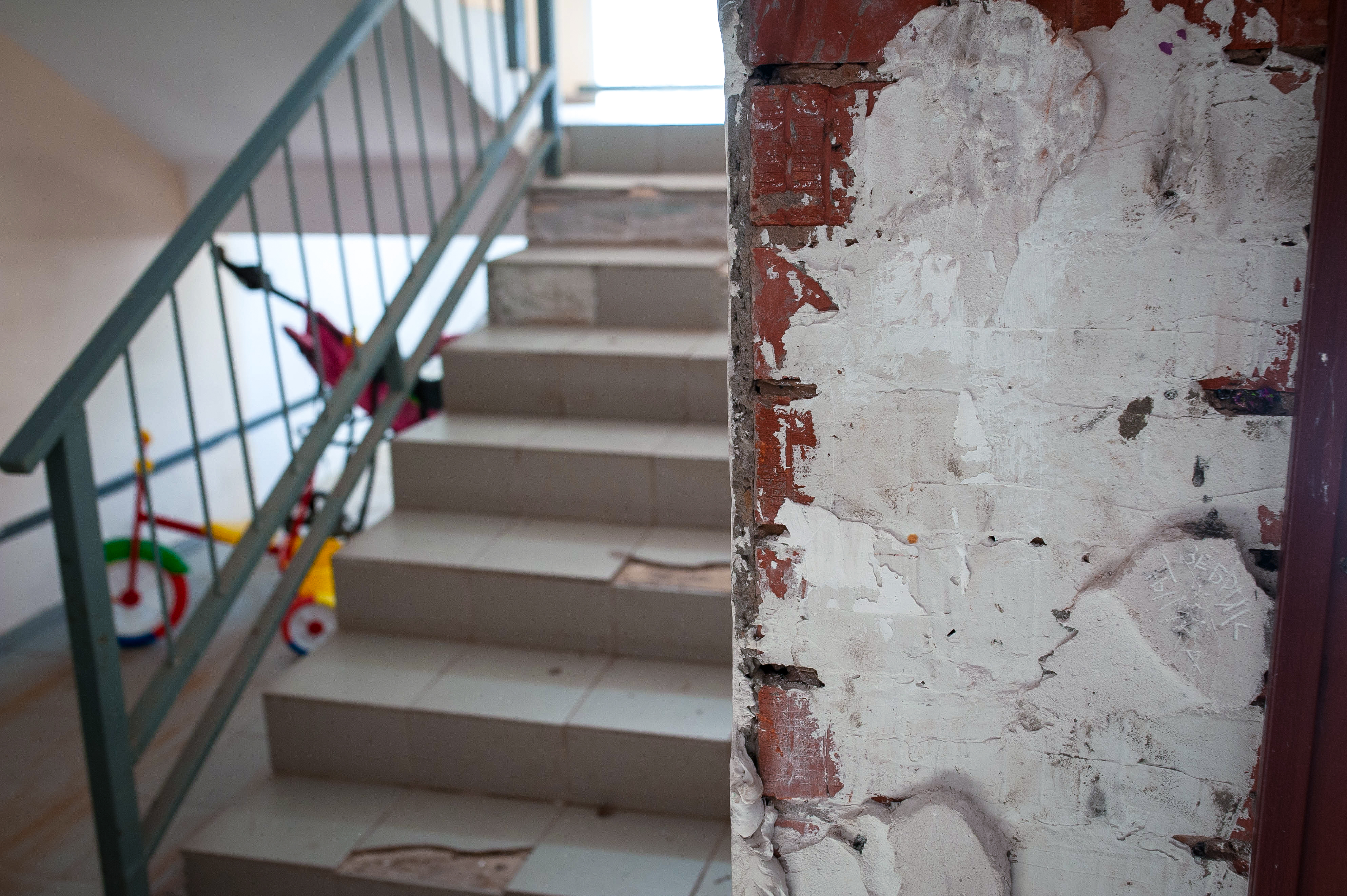 На лестнице в подъезде – разбитая плитка. Стены потрескались, и из-под краски проступают кирпичи. Замок на входной двери в подъезд не работает. Двери, разделяющие коридоры, – во вмятинах.