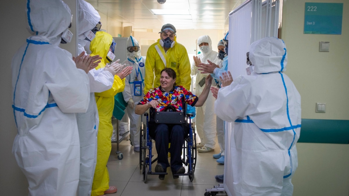 На пути к следующим пациентам Юлия Мохова встречает знакомые лица. Ее узнают, несмотря на защитный костюм. Многие обнимают.