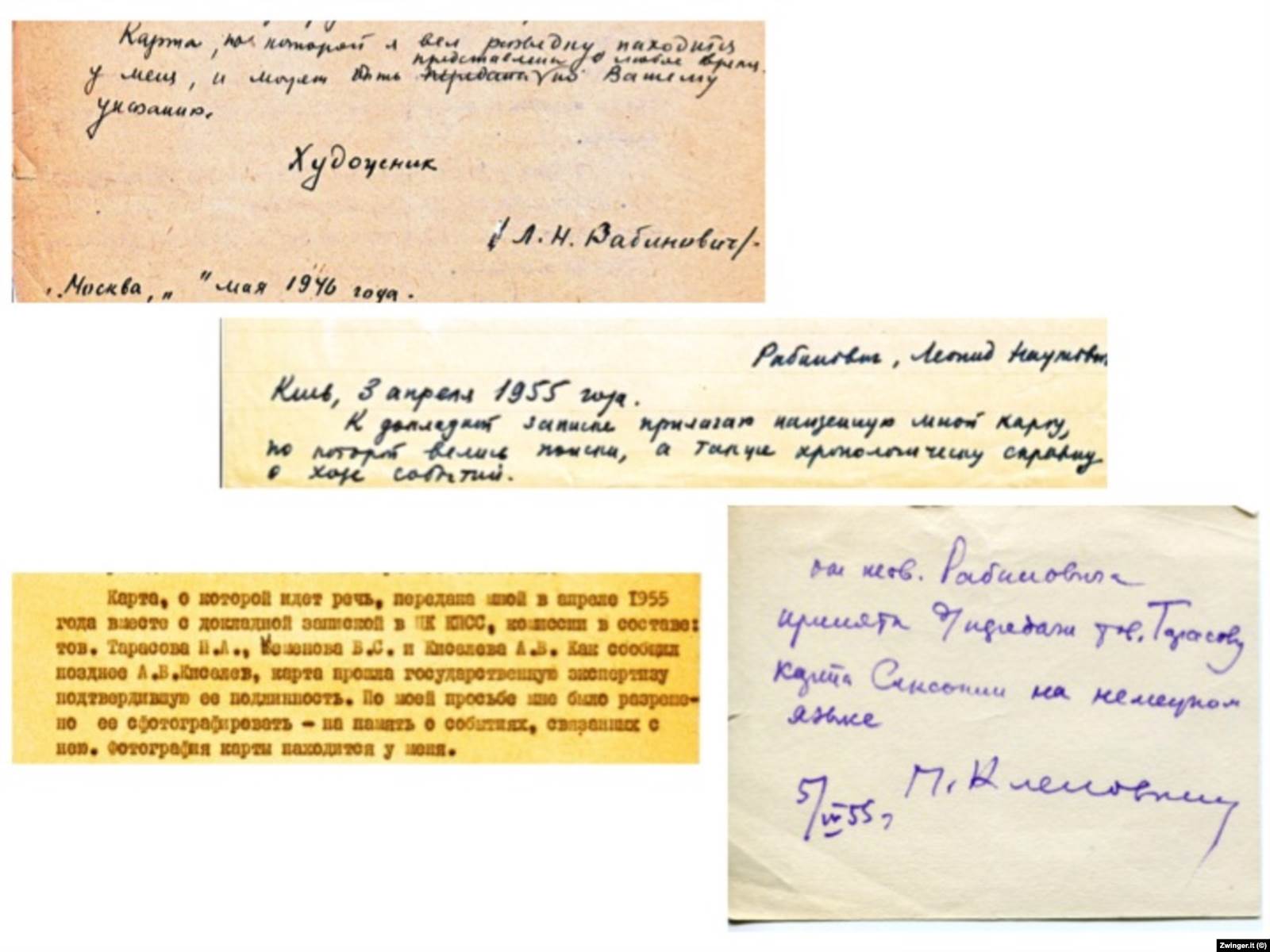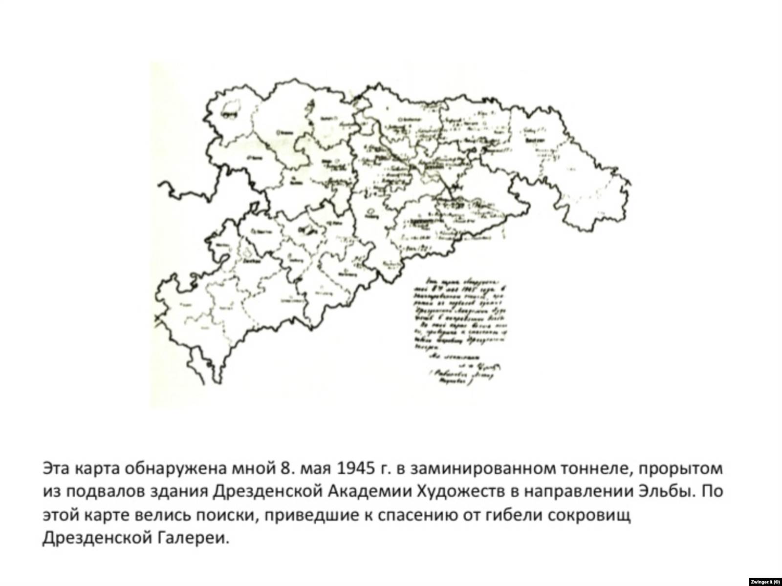 Леонид Рабинович в книге, которую он опубликует через 13 лет после дрезденских событий, рассказывает о "секретной" и "немой" (то есть без подписей и легенды) карте, которую он якобы нашел в ящике шкафа-секретера в подвале Альбертинума. Он дважды упоминает о ней и в официальных докладах в ЦК КПСС – в 1946 году и 1955-м, прилагает к одному из этих отчетов фотокопию. Но немецкие историки ставят под сомнение эту часть рассказа лейтенанта: никаких сведений о существовании такой карты и указаний на то, кем она могла быть составлена, нет. Рагна Энкинг пишет, что списки хранилищ Рабиновичу передали в замке Веезенштайн представители Министерства культуры, которые там скрылись.