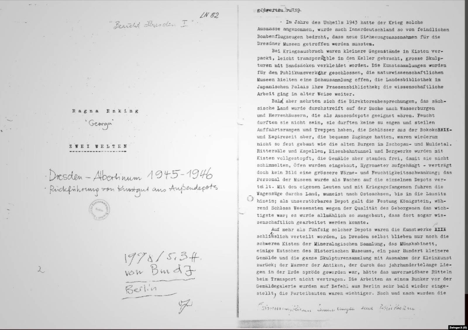 Забирая картины из подземелий, бараков и шахт, советские военные свозили их во дворец Пильниц под Дрезденом. А когда картины увезли, в этом же дворце Рагна Энкинг с коллегами открыли первую после войны большую экспозицию – "Центральный музей Саксонии". Это произошло в 1947 году, а уже через два года Энкинг отправили на пенсию, последовательно сместив со всех должностей. Через несколько лет Рагна уехала на запад, а потом в Италию, где работала в Римской академии искусств. Она умерла в 1975 году и похоронена на католическом кладбище в Риме.
