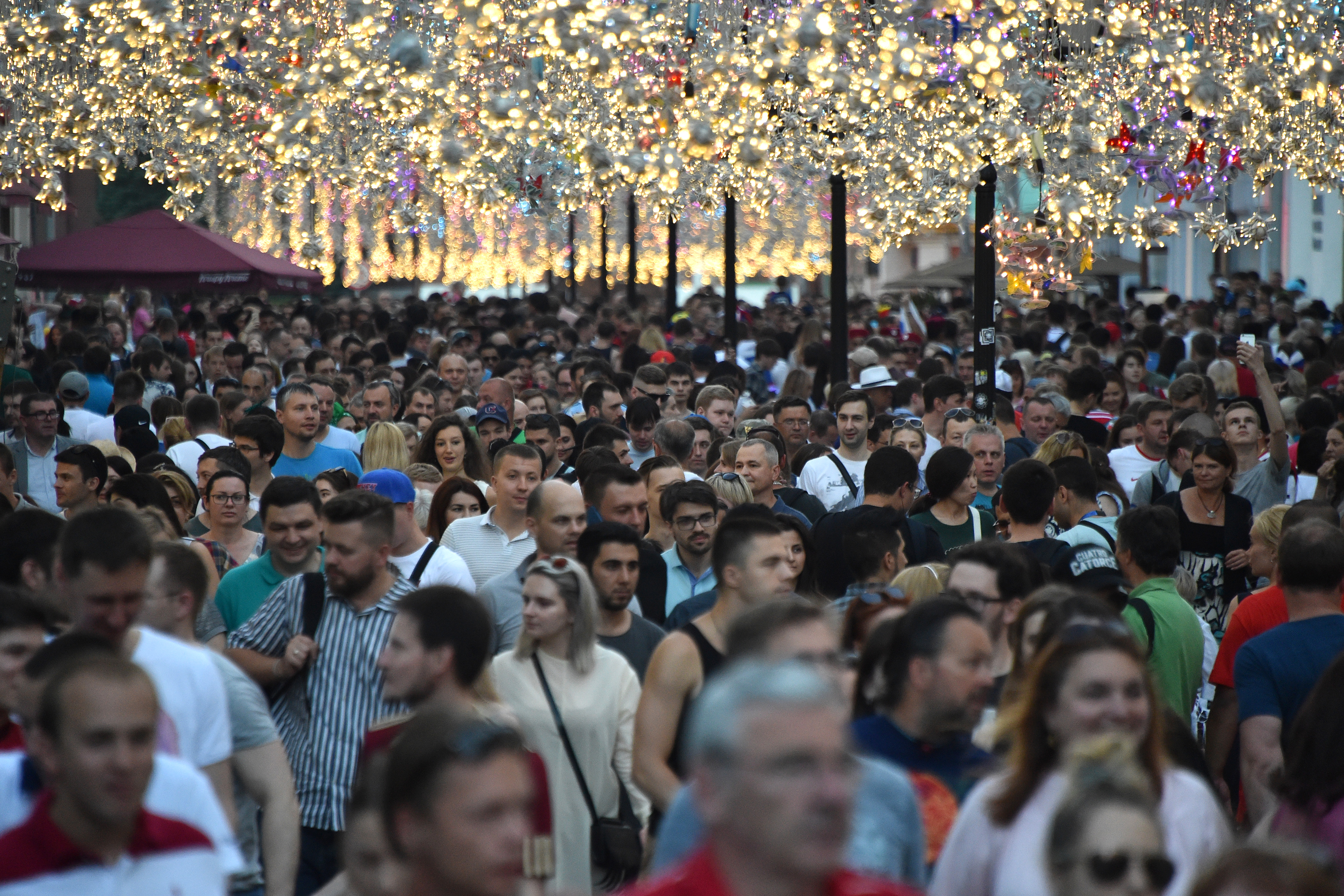 Болельщики Чемпионата мира по футболу на улице Никольской в Москве летом 2018 года. Фото: AFP