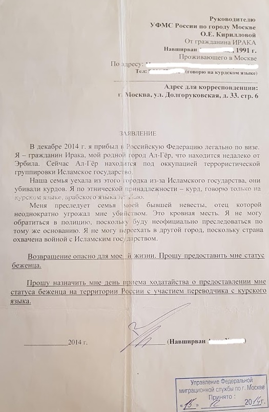 Первое заявление Навшервана о предоставлении статуса беженца. Фото: личный архив