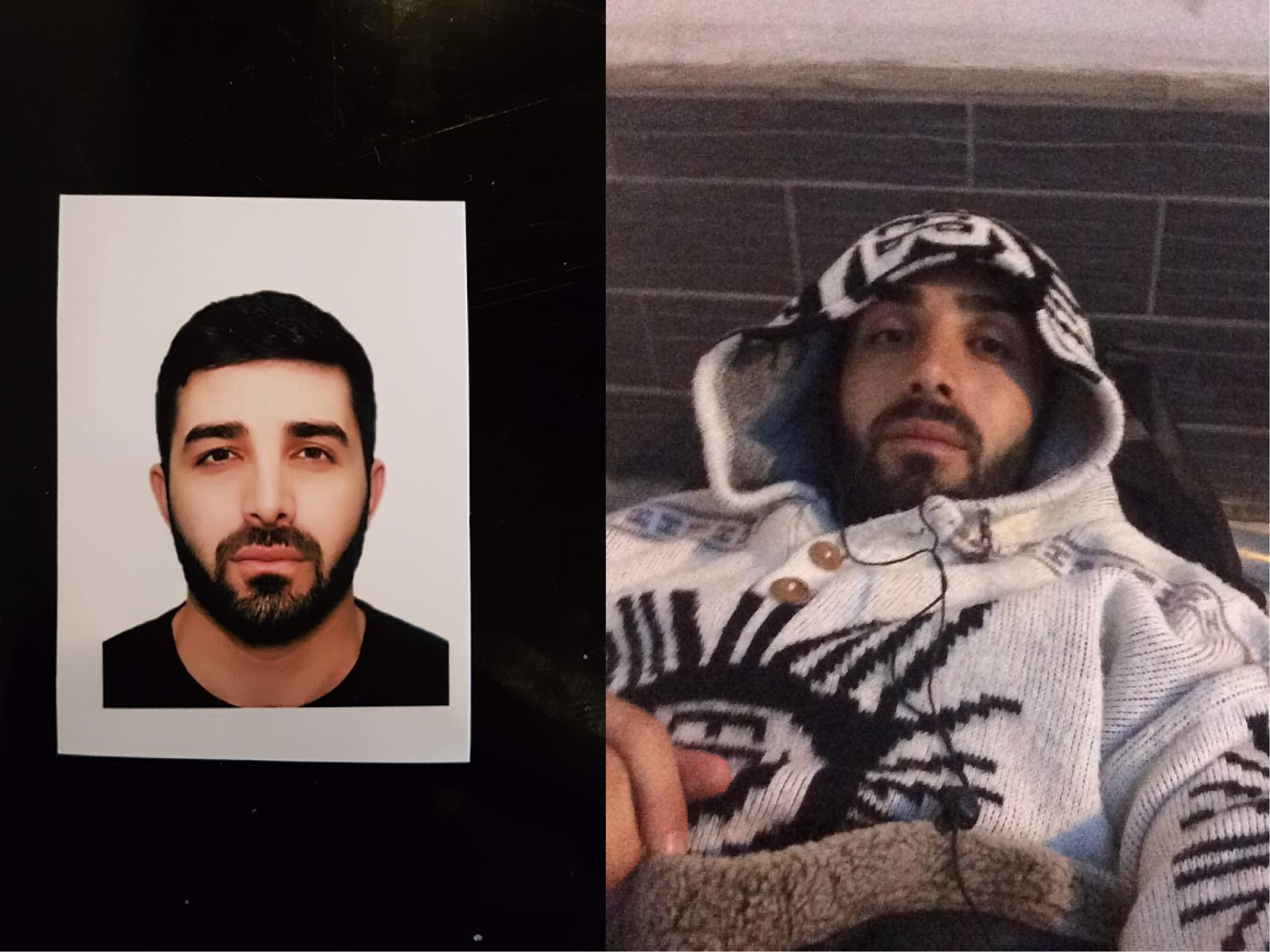 Слева – фотография для заявления на предоставление временного убежища. Справа – селфи Навшервана во время ночевки на улице