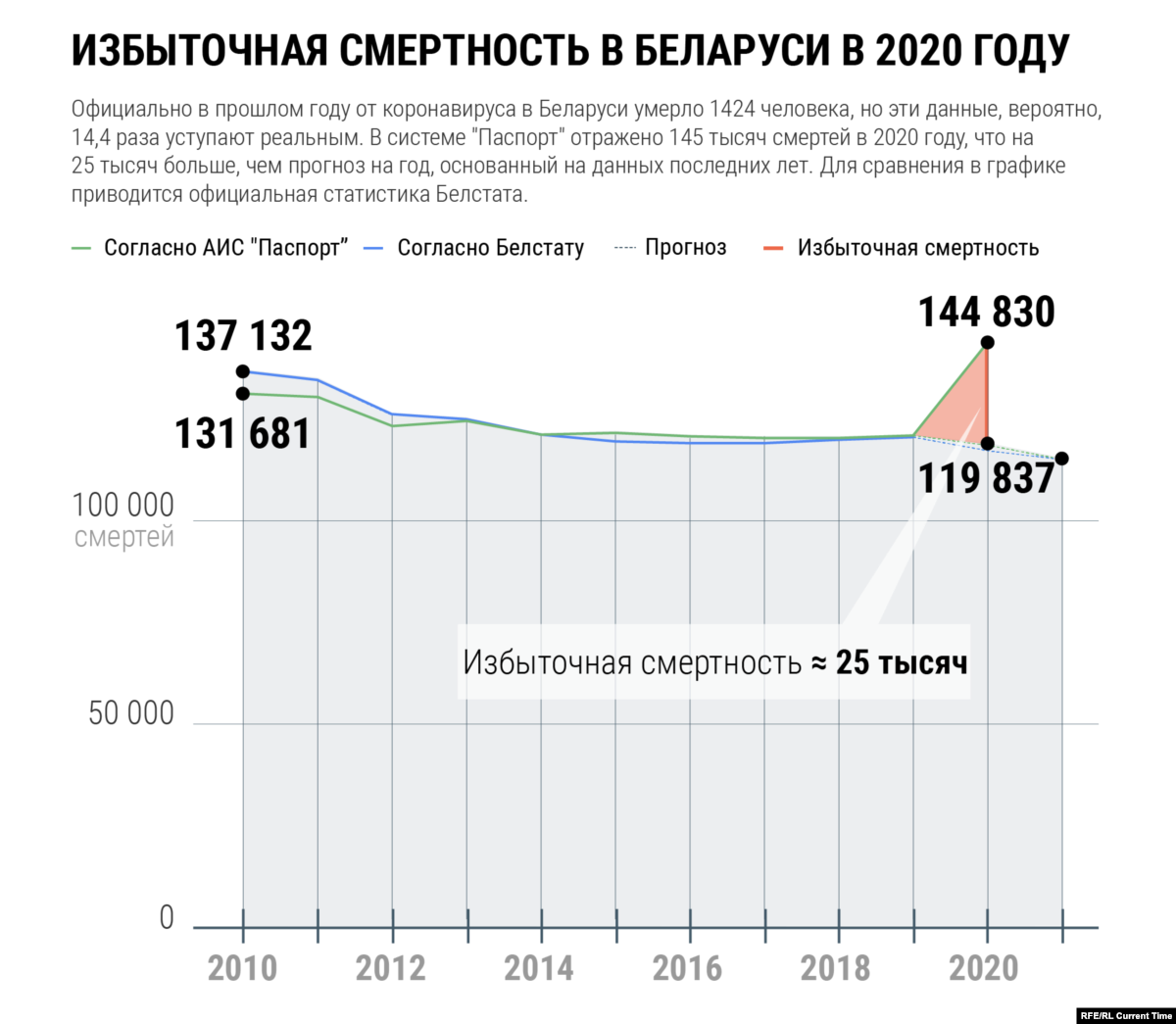 Сколько же людей умерли от коронавируса? Официально в 2020 году – 1424 человека, а к концу марта 2021-го – 2247. Но согласно показателям избыточной смертности ("золотой стандарт", по которому определяют масштабы эпидемии коронавируса) – на порядок больше. В Беларуси в 2020 году избыточная смертность составила 25 тысяч человек. Это реальная смертность (145 тысяч) минус прогнозируемая смертность на основе данных предыдущих лет (120 тысяч).