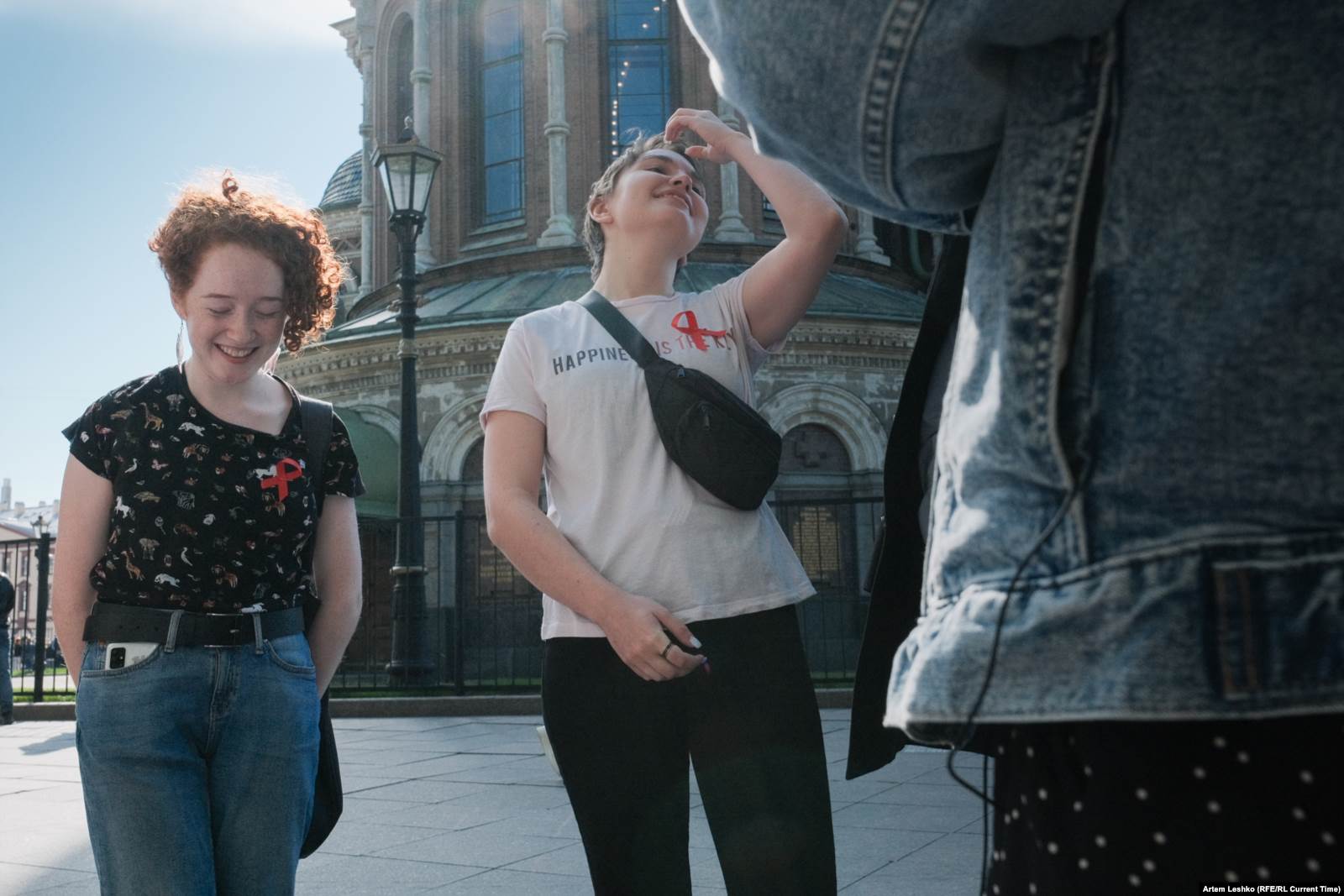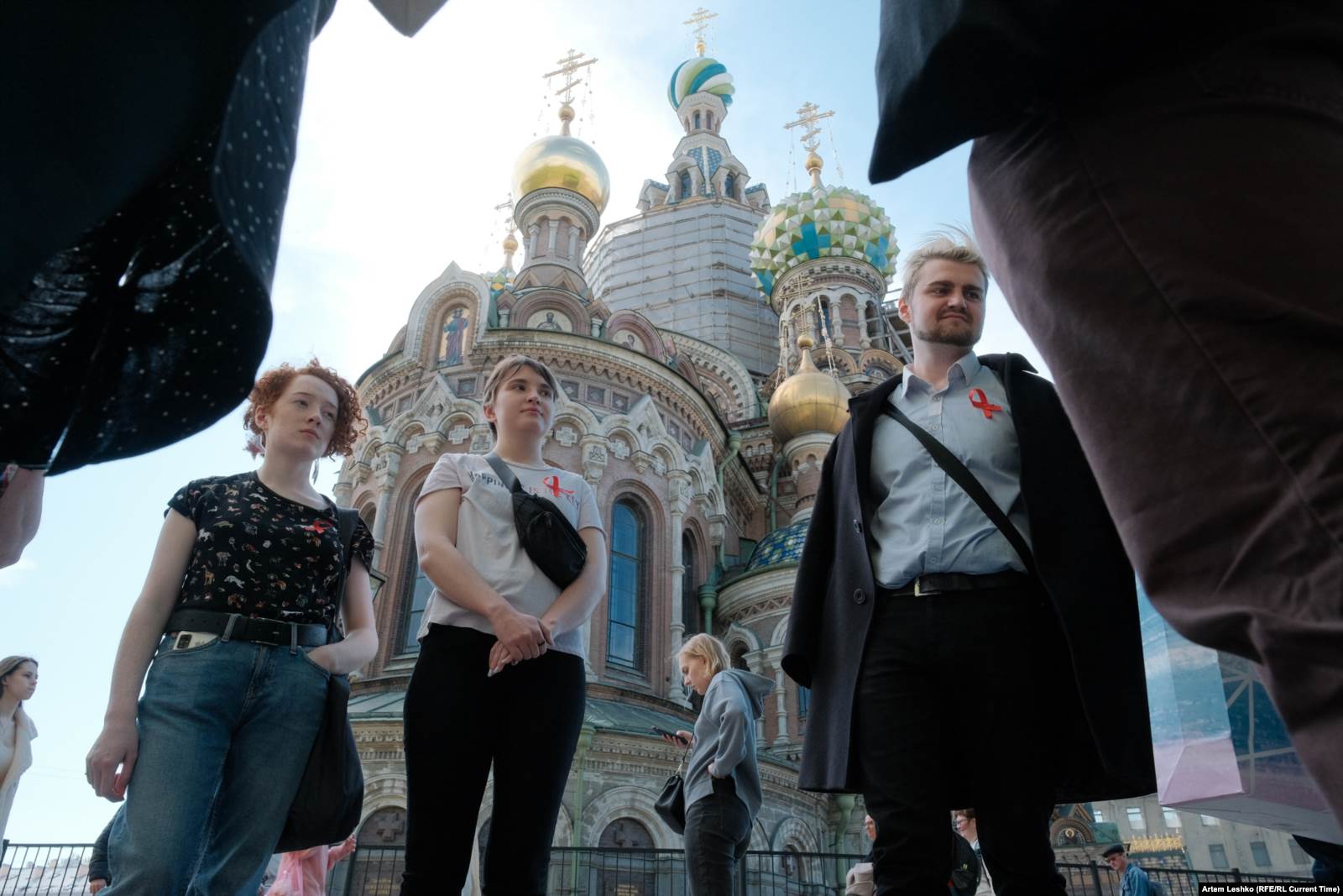 На солнце у храма Спаса на Крови собирается небольшая группа людей, у многих приколоты к одежде красные ленты – символ борьбы со СПИДом. О месте встречи организаторы акции сообщили только за два дня, в пятницу, и на всякий случай приготовили контакты "ОВД-Инфо", если полиция решит задерживать скорбящих. Но обошлось.