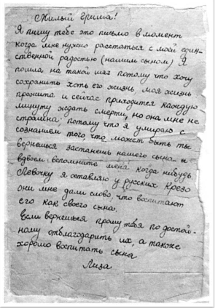 "Милый Гриша! Я пишу тебе это письмо в тот момент, когда мне нужно расстаться с моей единственной радостью (нашим сыном). Я пошла на такой шаг, потому что хочу сохранить хоть его жизнь, моя жизнь прожита и сейчас приходится каждую минуту ждать смерти. ... Лёвочку я оставляю у русских Крезо. Они мне дали слово, что воспитают его как своего сына. Если вернешься, прошу тебя по-достойному отблагодарить их, а также хорошо воспитать сына. Лиза".
