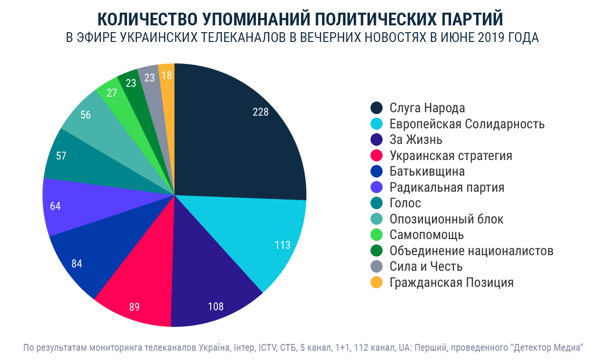 Партия Владимира Зеленского стала лидером по количеству упоминаний: в эфирах ее деятельность комментировали 288 раз. (Сюда включены и упоминания Зеленского как президента). При этом не было ни одного негативного упоминания: партия упоминалась только в нейтральном и позитивном ключе. И лишь на 5 канале не было ни единого позитивного упоминания. Больше всего позитивных комментариев было на ICTV, 1+1 и "Украине".