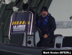 Журналисты Радио Свобода приехали в Каррару 24 января, предварительно договорившись об аренде небольшой лодки в марине. Когда мы подходили к пирсу, на "Шахерезаде" все было спокойно – на палубе было лишь несколько человек. Как только мы отплыли и стали проплывать вдоль левого борта яхты, ситуация кардинальным образом изменилась.