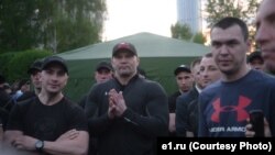 На других фотографиях, сделанных 13 мая в Екатеринбурге, обращает на себя внимание высокий, мускулистый человек в надвинутой на глаза бейсболке и толстовке с логотипом Under Armour. На одном из видео он грубо отвечает протестующим против строительства храма и заявляет, что они пришли к скверу за деньги. Его слова встречают дружным смехом.
