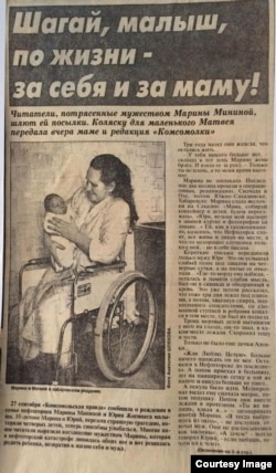 Муж отбил этот номер, повесил фото дочери, – говорит Марина Минина. – Дальше жили без детей. Я не могла смотреть на других детей. Когда мы прожили года полтора, решили рискнуть – попробовать родить без ног. И через два месяца я забеременела Матвейкой. Сыночка родился 3600. Мы с Юрой ругались, кто его будет носить на руках. Одна гуманитарная помощь у нас была – простынь в полосочку. Я все думала разорвать ее на четыре части, чтобы было четыре пеленки. А когда пришли к нам из общества инвалидов, то принесли пеленки, распашонки, стали присылать посылки, деньги. Я очень благодарна всем людям за помощь. А потом появилась Дашенька. Они погодки. Сейчас Даше 21 год, Матвею – 22 года. Они хорошие дети. 28 мая я скорблю, стараюсь ни с кем не общаться, уже не кричать, не плакать, а просто в душе помянуть".